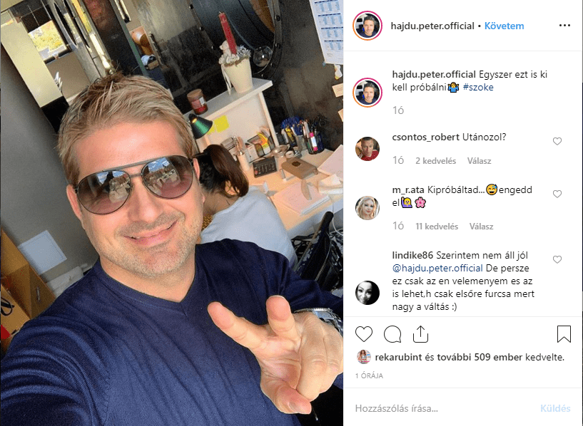 „Egyszer ezt is ki kell próbálni” – írja a kép mellett Hajdú Péter, aki valószínűleg ezt a frizurát csupán az április elseje, vagyis a bolondok napja miatt posztolta. Vagy tényleg átfestette? Mindenesetre szerintünk a régi jobb volt.