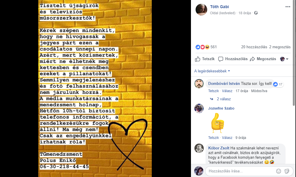 A kommentelők közül viszont sokan jelezték, hogy ha így gondolják, akkor az örömhírrel is várhattak volna, illetve többen is írták, hogy a magánéletét ez esetben nem kellene ország-világ elé tárni Tóth Gabinak, és akkor ez nem járna kellemetlen következményekkel.