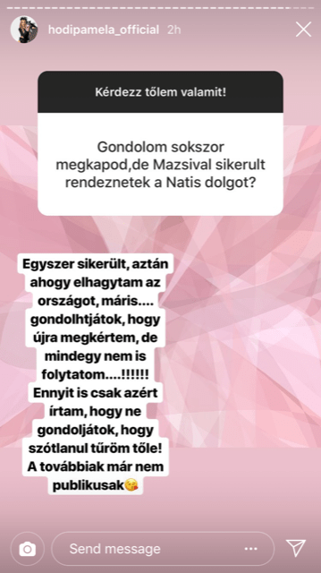 „Egyszer sikerült, aztán ahogy elhagytam az országot, máris… Gondolhatjátok, hogy újra megkértem, de mindegy is, nem folytatom!!! Ennyit is csak azért írtam, hogy ne gondoljátok, hogy szótlanul tűröm tőle. A továbbiak már nem publikusak” – írta rajongója kérdésére válaszul Hódi Pamela.
