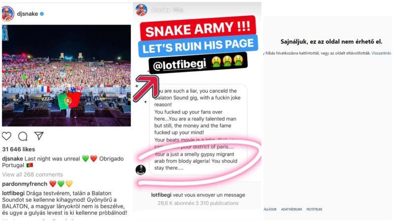 Sean Paul mellett DJ Snake is lemondta a Balaton Soundon esedékes koncertjét, amiért elég sokan beszóltak neki a közösségi oldalán. Lotfi Begi is írt az oldalára, de csupa kedves dolgot, majd pár órával később egy gyűlölködő komment is megjelent, amit a DJ nevében írt valaki a világsztárnak – szúrta ki a 24.hu.
