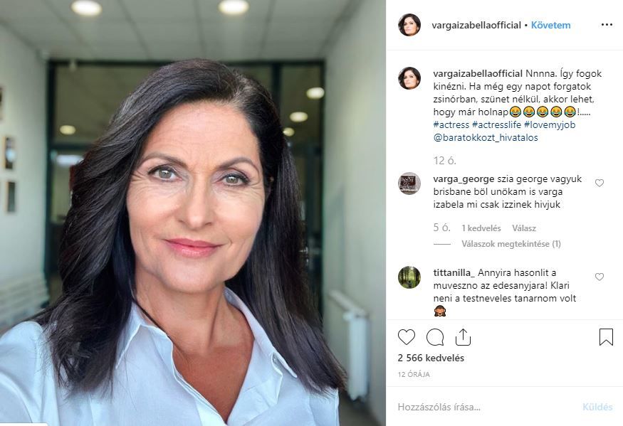 „Nnnna. Így fogok kinézni. Ha még egy napot forgatok zsinórban, szünet nélkül, akkor lehet, hogy már holnap” – írja a közösségi oldalán Varga Iza, akit a rajongók megnyugtattak, hogy így is nagyon csinos, és 20 év múlva is bomba nő lesz.