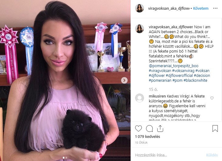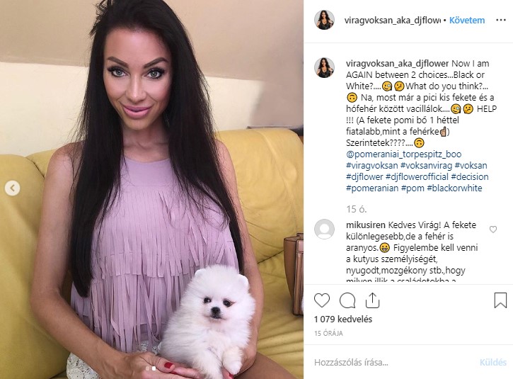 Szobakutyus méretű eb bújik Voksán Virág mellkasa előtt/alatt, az egykori playmate pedig arra kéri közel 100 ezres követőtáborát, hogy segítsenek eldönteni, melyik legyen az ő hű társa.