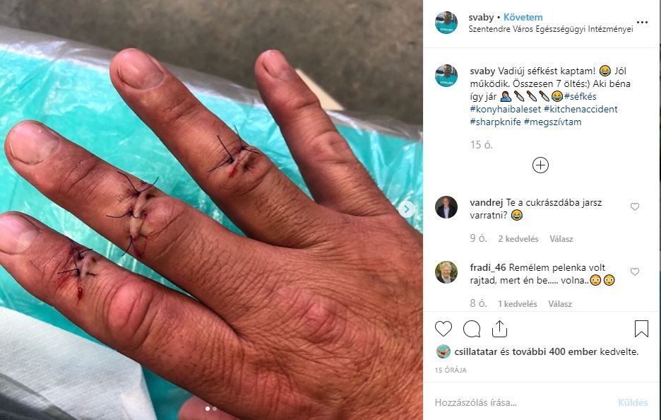 „Vadiúj séfkést kaptam! Jól működik. Összesen 7 öltés. Aki béna így jár” – írta a közösségi oldalán Sváby András, aki természetesen képet is mellékelt a balesetről. A rajongók már a látványtól is kivannak, jobbulást kívántak az ATV műsorvezetőjének.
