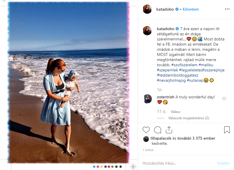 „7 éve ezen a napon itt sétálgattunk az én drága szerelmemmel… Most dobta fel a FB. Imádom az emlékeket! De imádok a mában is lenni, megélni a MOST izgalmát! Mert bármi megtörténhet, rajtad múlik merre tovább” – írja a fotóhoz Dobó Kata, a rajongók pedig megállapították, hogy nagyon gyorsan száll az idő.