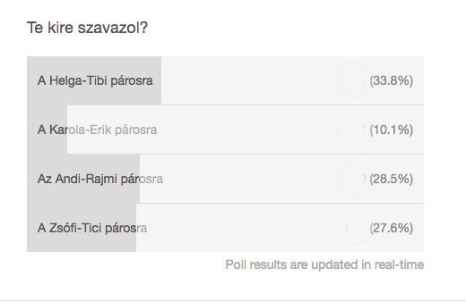 A szavazásunk még most is él, Zsófi és Ticián párosa szépen felkúszott szombat estére, de Rajmi és Andi rajongói minden alkalommal megtolták a kedvenceiket, így a két pár helyzete váltakozik. Jelenleg ez azt jelenti, hogy a második és a harmadik hely sorsa még nem dőlt el.