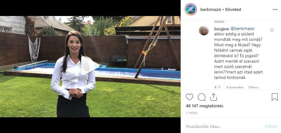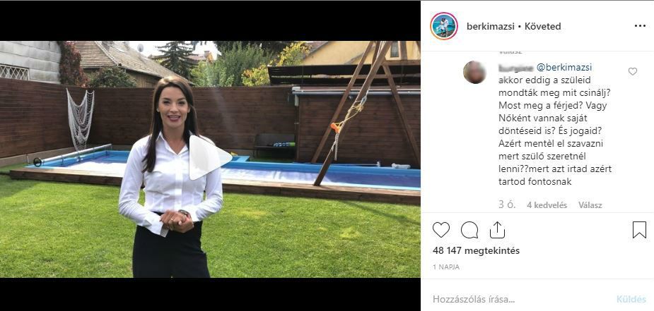 „Mert segítettek a szüleim, és nem voltam rákényszerítve, hogy foglalkozzam a jövőmmel erről az oldalról, de ma már én is szülő szeretnék lenni és felelős döntésnek tartom a szavazást” – írta Berki Krisztián felesége, aki később még hozzátette, hogy szerinte nincs egyedül ezzel. Korábban nem érdekelte a politika, most viszont a férje miatt már sokat tanult erről, ezt pedig bátran vállalja. Mazsi válaszait megköszönték a kérdezők, mert szerintük is ritka, hogy valaki a kellemetlen kérdéseket nem kerüli ki, hanem válaszol azokra.