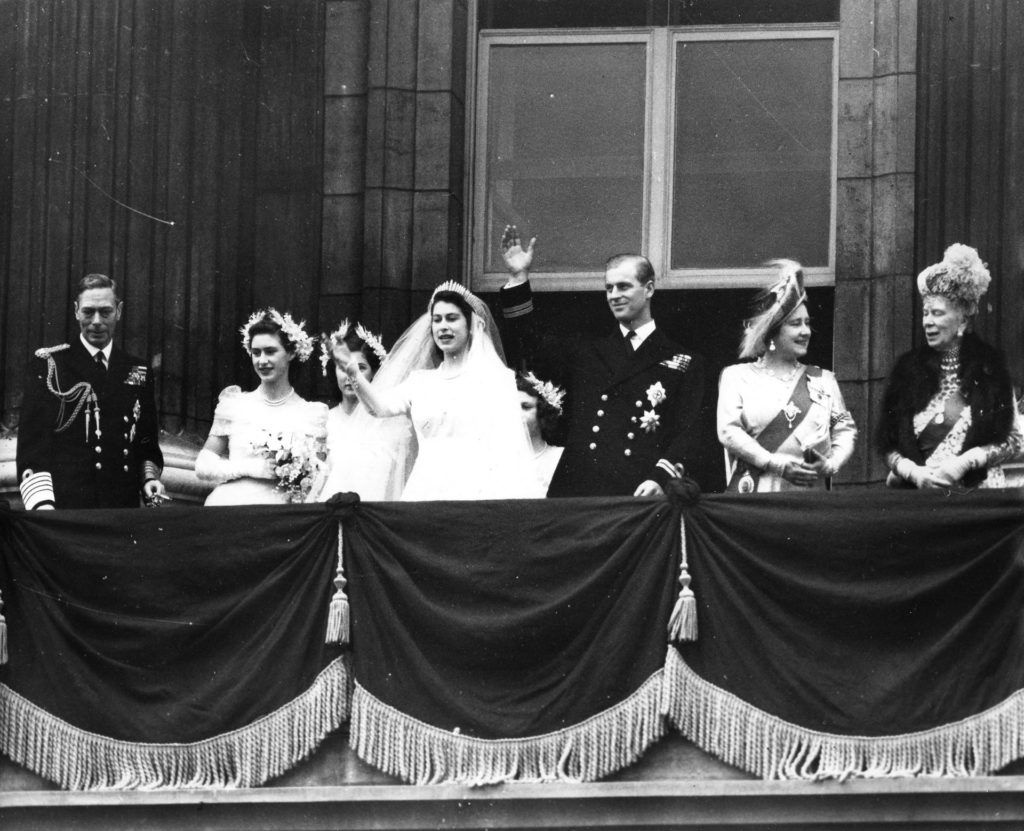 Erzsébet hercegnő és Fülöp edinburgh-i herceg a palota erkélyéről integet a tömegnek (Fotó: PhotoQuest/Getty Images)
