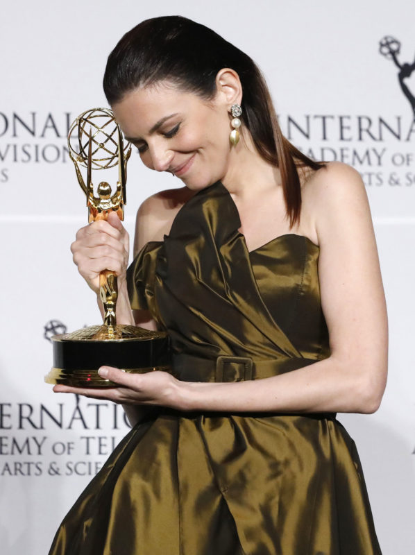 Gera Marina a New York-i Hilton Szállodában tartott fotózáson, miután átvette a legjobb színésznőnek odaítélt Emmy-díjat az Örök tél című filmben nyújtott alakításáért (Fotó: MTI/EPA/Jason Szenes)