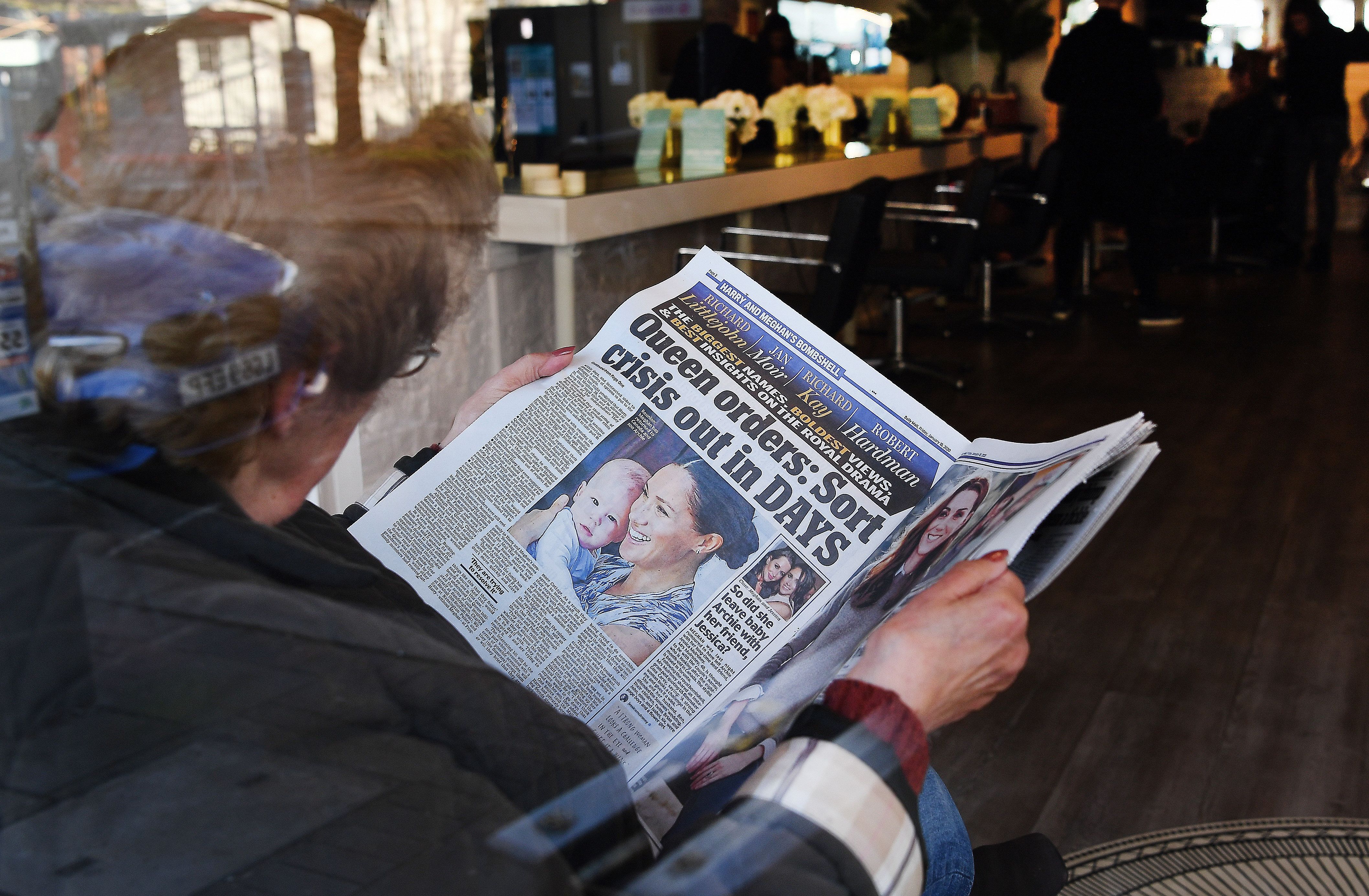 Harry sussexi hercegrõl, a brit trónörökös másodszülött fiáról és a feleségéről, Meghan sussexi hercegnőről szóló cikket olvas egy nő egy londoni fodrászüzletben 2020. január 10-én (Fotó: MTI / EPA / Andy Rain)