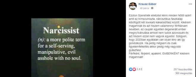 „Ezúton Szeretnék elnézést kérni minden Nőtől azért, amit ez hímsoviniszta, nárcisztikus (…) kiböfögött két lowkarb kakaòsl..sz között. Kikérem magamnak és azt hiszem valamennyi férfitársam nevében, ez csupán egyetlen degenerált ember megnyilvánulása, amivel nem tudok azonosulni és azt hiszem ezzel nem vagyok egyedül. Szégyen, hogy 2020-ban egyáltalán van olyan lény, aki így gondolkozik. Ha pedig mégsem és csak figyelemfelkeltés akkor pedig még nagyobb gyász(…). Férfiként, férjként, apaként, EMBERKÉNT kikérem magamnak!” – írta Tóth Gabi férje, a chef Krausz Gábor Facebook-oldalán. A párnak egyébként nemrég született meg első gyereke.