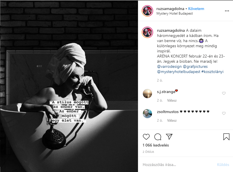 „A stílus mögött az ember van. Az ember mögött egy élet van” – írta a fotóra Rúzsa Magdi, aki megjegyzésként hozzátette, hogy általában ebben a pozícióban készülnek a dalszövegei. Akkor is, ha üres, és akkor is, ha vízzel teli a kád. Micsoda inspiráló környezet!