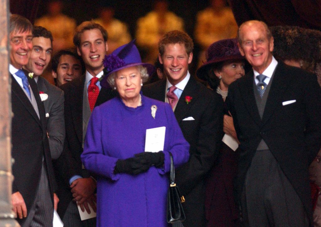 Valami nagyon szórakoztatta Vilmos, Harry herceget és Fülöpöt Lady Tamara Katherine Grosvenor esküvőjén 2004-ben. De a királynőt nem nyűgözte le… (fotó: Mark Cuthbert/UK Press via Getty Images)