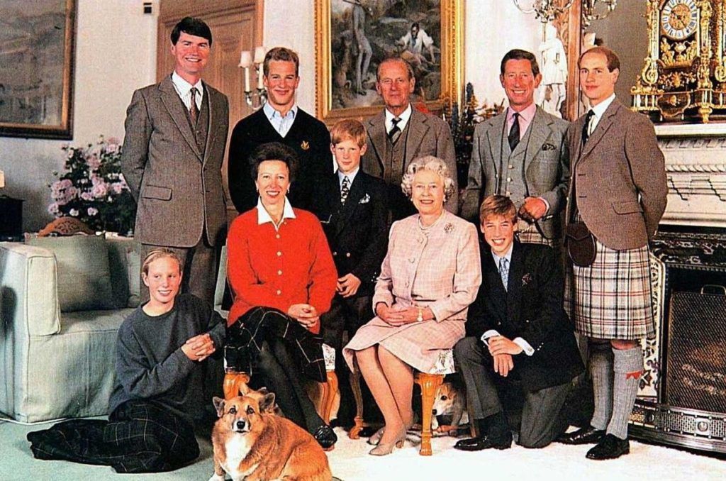 II. Erzsébet egyik üdvözlőlapja 1996-ból. A képen: Anna hercegnő, Tim Lawrence, Peter Phillips, Fülöp herceg, Károly herceg, Eduárd herceg, Zara Phillips, Harry herceg, II. Erzsébet, Vilmos herceg. (fotó: Profimedia)