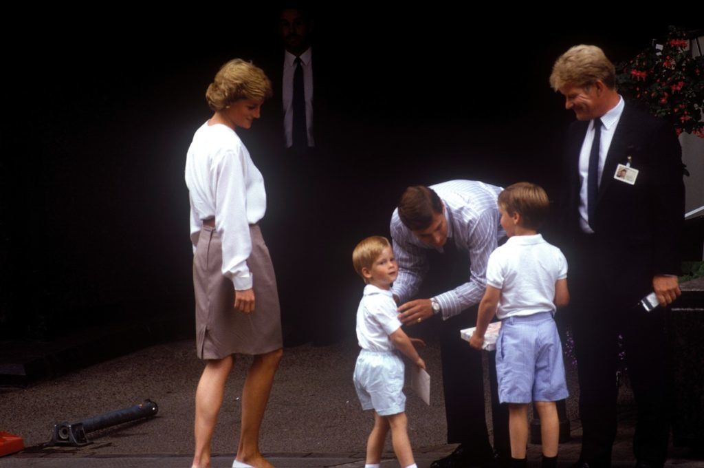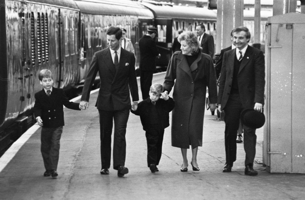 Károly herceg, Harry, Vilmos és a fiúk dadája sietnek a vonathoz az Aberdeenben található állomáson. A kép 1989-ben készült. (fotó: Prodimedia)