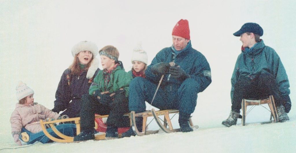 Károly herceg és két fia, valamint sógornője, Sarah és annak két lánya 1995-ben. A család gyakran járt síelni. (fotó: Profimedia)