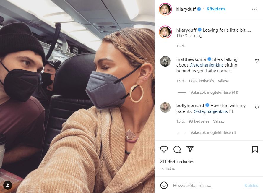 Hilary Duff három gyereke nem ugyanattól az apától született. A két kisebb lány, a hároméves Banks Violet és a nyolc hónapos Mae James édesapja Hillary jelenlegi férje, Matthew Koma, míg a színésznő kilencéves fia, Luca Cruz apja az exférj, Mike Comrie. Hillary Duff hétfőn posztolt egy férjével közös szelfit az Instagramra, melyen egy repülőn ülnek, és azt írta hozzá, hogy „Egy kicsit elmegyünk… mi hárman.”