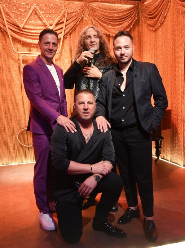 Zámbó Sebastián, Zámbó Krisztián, és Zámbó Adrián, Jimmy viaszfigurájával a Madame Tussauds budapesti kiállításán (Fotó: Olajos Piroska)