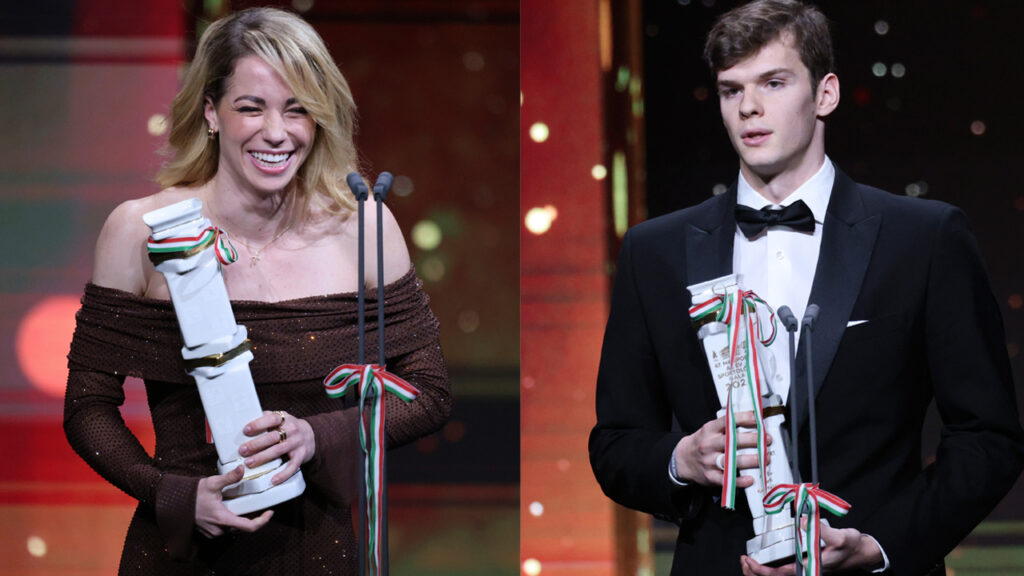Gulyás Michelle az Év női sportolója díjjal és Kós Hubert, miután átvette az Év férfi sportolója díjat – Fotók: MTI/Hegedüs Róbert