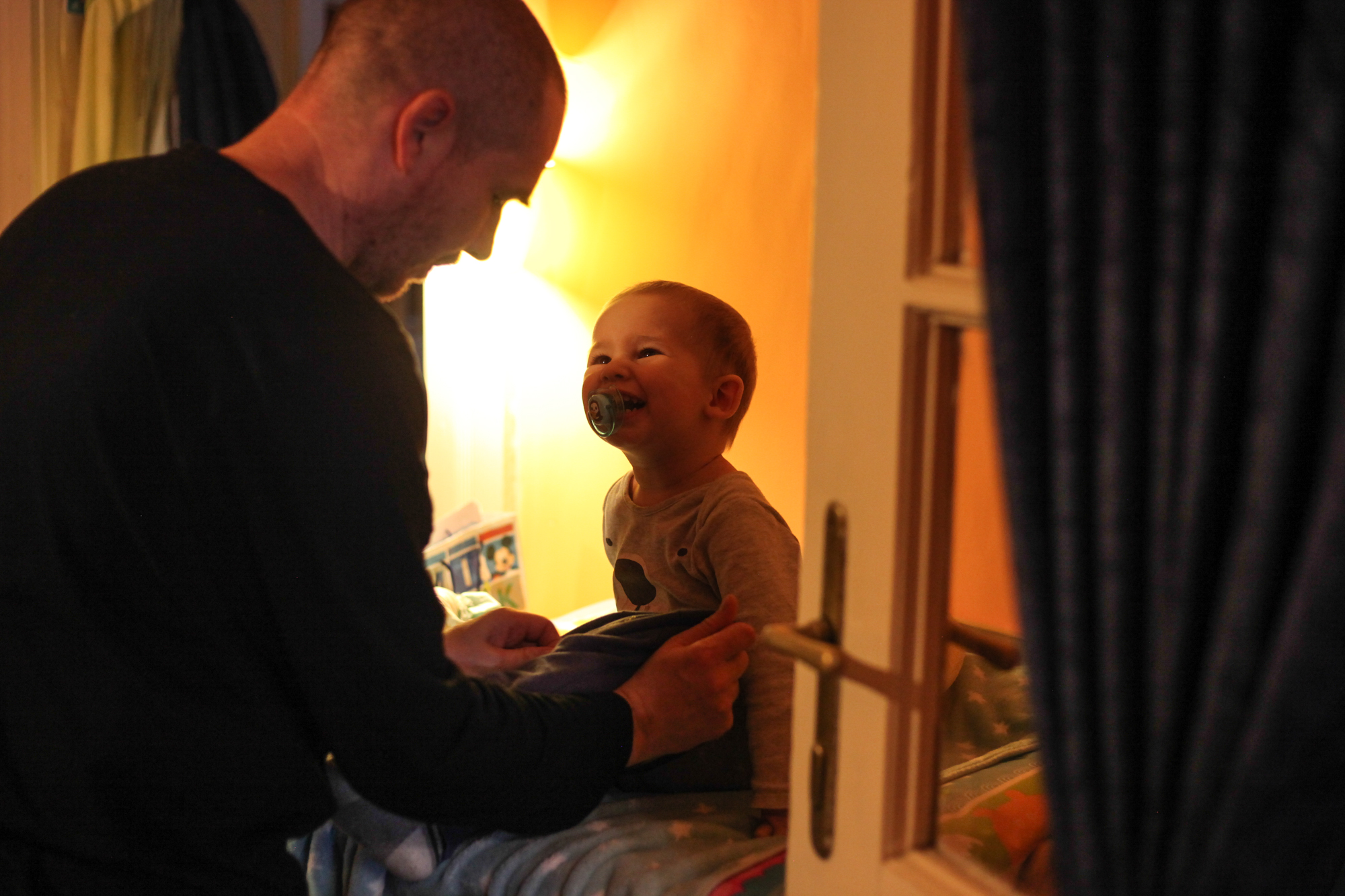 Gyere, megnézzük a pelust, már biztos sok a pisi. Fúúúj, kaktusz bónusz. Nevetnek. Fúj, de büdös van nálad! … Kész vagyunk. Hoppá, apa elfelejtette a nadrágot. Cumcum, tessék. Nem. Megcsipkedlek! Gyere, itt a nadrág. Ne egyszerre a kettőt, Életem. Jaj, de szeret apa, te vacak!
