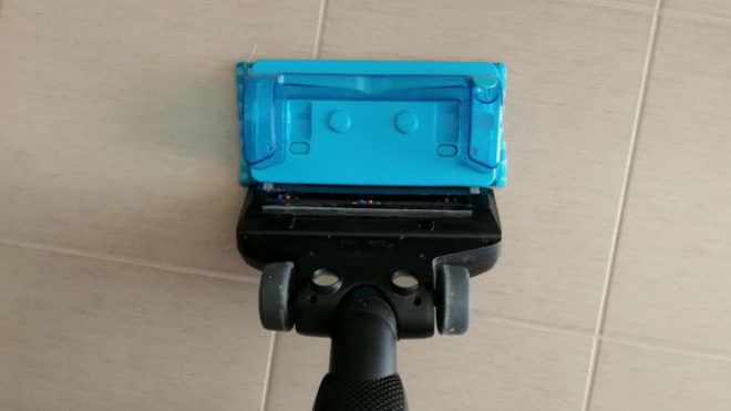 Maga a felmosás része a dolognak is rém egyszerű és kényelmes: a készülék víztartályába cirka két deci víz és csupán pár csepp tisztítószer szükséges, és maga a felmosó tartály két erős mágnestappancs segítségével cuppan rá a fejre.