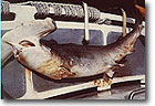 S még mielőtt azt hinnénk, hogy a cápákat kimondottan cápavadászok ejtik foglyul, megemlítendő, hogy a cápák mai legnagyobb ellenségei inkább a „túlhalászók”, a cápákat „mellékesen” kifogó tengeri halászok, akik elsősorban tonhalra vadásznak, s hálójukban bennrekednek a cápák is. A hálóharc után vagy döglötten kerülnek vissza a vízbe (megfulladnak), vagy szép fehérre festett falakra kerülnek kitömve, míg eldobott részeik óceán-turkálóként a cápafogra éhes hiénák randevújává válik. Gondoljunk erre, mikor egészséges, „mű” óceán-hősnek szeretnénk magunkat érezni, tablettát nyelni, levest szürcsölni egy szexisebb, egészségesebb élet érdekében.