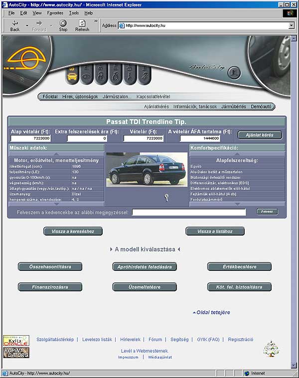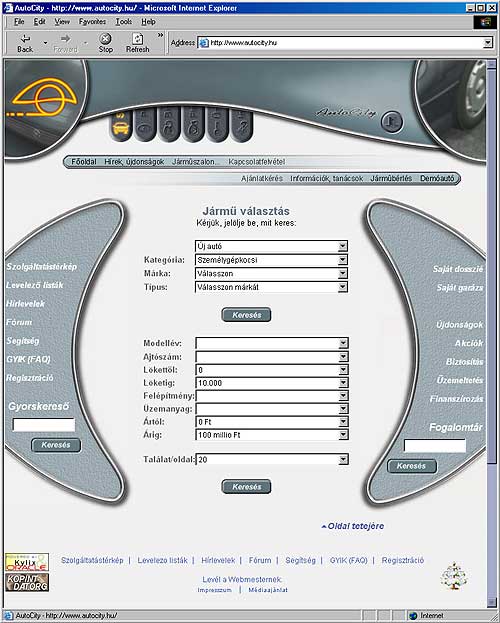 • Az Auto City üzemeltetője az Euroleasing cégcsoport, amelynek köszönhetően az ügyfelek a kiválasztott modelleket országosan közel 400 kereskedő készleteiből érhetik el. A készletadatok naponta frissülnek, elsősorban a CarNet hálózat segítségével. Látogatói szabadon csemegézhetnek minden jelenleg forgalmazott modell részletes adataiból és képeiből – számuk 2500 közelébe tehető -, valamint további 10.000, az elmúlt 20 évben forgalmazott modellekből.