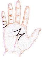 Az Élet-vonal a hüvelykujj és a mutatóujj között kezdődő íves barázda, amely a csuklónál fordul be a kézfej felé. Az Értelem-vonal az Élet-vonal szomszédságában indul, és vízszintesen a Mars- vagy a Hold-dombig szeli át a tenyeret. Ha ez a vonal hiányzik, az agy betegségére, vagy fokozott ösztönéletre enged következtetni. A Sors-vonal az egyetlen barázda, amelyet lentről felfelé értelmezünk, az Élet-vonal vége felé kezdődik, onnan fut a gyűrűsujj alá. Feltűnő rövidsége hirtelen elmúlást, vagy egy bizonyos helyzet hirtelen félbe szakadását jelenti. Felfelé mutató elágazásai, amelyek körülbelül a vonal közepénél kezdődnek, szerencsét és sikereket mutatnak, különösen akkor, ha a Szív-vonallal való kereszteződésében nincsen különös törés. A Szív-vonal kedvező esetben összeköti az érzelmi életet a külső sikerekkel, így a kép egy szimpatikus, a valóságban élő személyiséget vetít elénk. Ez az íves barázda vízszintesen szeli át a tenyeret, az ujjak alatt, mintegy lezárva az alatta emelkedő dombokat, amelyeket függőlegesen a Sors-vonal foglal keretbe.