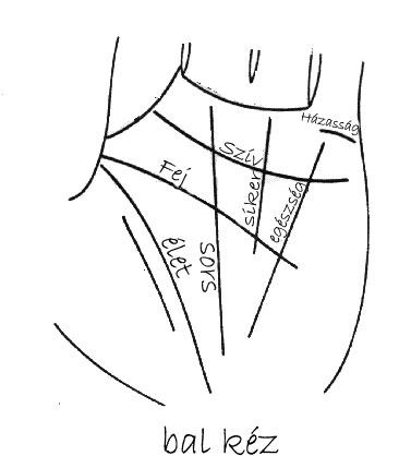 Az Élet-vonal a hüvelykujj és a mutatóujj között kezdődő íves barázda, amely a csuklónál fordul be a kézfej felé. Az Értelem-vonal az Élet-vonal szomszédságában indul, és vízszintesen a Mars- vagy a Hold-dombig szeli át a tenyeret. Ha ez a vonal hiányzik, az agy betegségére, vagy fokozott ösztönéletre enged következtetni. A Sors-vonal az egyetlen barázda, amelyet lentről felfelé értelmezünk, az Élet-vonal vége felé kezdődik, onnan fut a gyűrűsujj alá. Feltűnő rövidsége hirtelen elmúlást, vagy egy bizonyos helyzet hirtelen félbe szakadását jelenti. Felfelé mutató elágazásai, amelyek körülbelül a vonal közepénél kezdődnek, szerencsét és sikereket mutatnak, különösen akkor, ha a Szív-vonallal való kereszteződésében nincsen különös törés. A Szív-vonal kedvező esetben összeköti az érzelmi életet a külső sikerekkel, így a kép egy szimpatikus, a valóságban élő személyiséget vetít elénk. Ez az íves barázda vízszintesen szeli át a tenyeret, az ujjak alatt, mintegy lezárva az alatta emelkedő dombokat, amelyeket függőlegesen a Sors-vonal foglal keretbe.