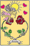 Ezt a lapot rakjuk körül akkor, ha a szerelem témája érdekel bennünket. A kártyán egy puttó vagy Ámor–Cupido látható. Illusztrációnkon Ámor szárnya pávatollakból áll. A páva a hiúság és a remény jelképe, a tollak végén látható „pávaszemek” sokasága valójában mindig nyitott, mindent látó és megfigyelő tekinteteket jelez: a szerelem vak, de mégsem lehet kitérni előle. Az egymás felé hajló rózsaágak szívet képeznek. Száruk tüskés, elszakíthatatlan kötelet formáz. A levelek kígyószerűen csavarodnak a szárak körül, a szerelem ösztön– energiáinak megfelelően.