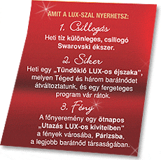 Valamint mind a négy megjelölt időpontban még egy további nyertest is kisorsolnak, aki pedig esti Lux-os programot nyer, amelyre a nyertes 3 kísérőt vihet magával. A program előtt a program résztvevőit egy profi csapat (fodrász, sminkes, stylist) változtatja át, ezt a játékban résztvevők vállalják.