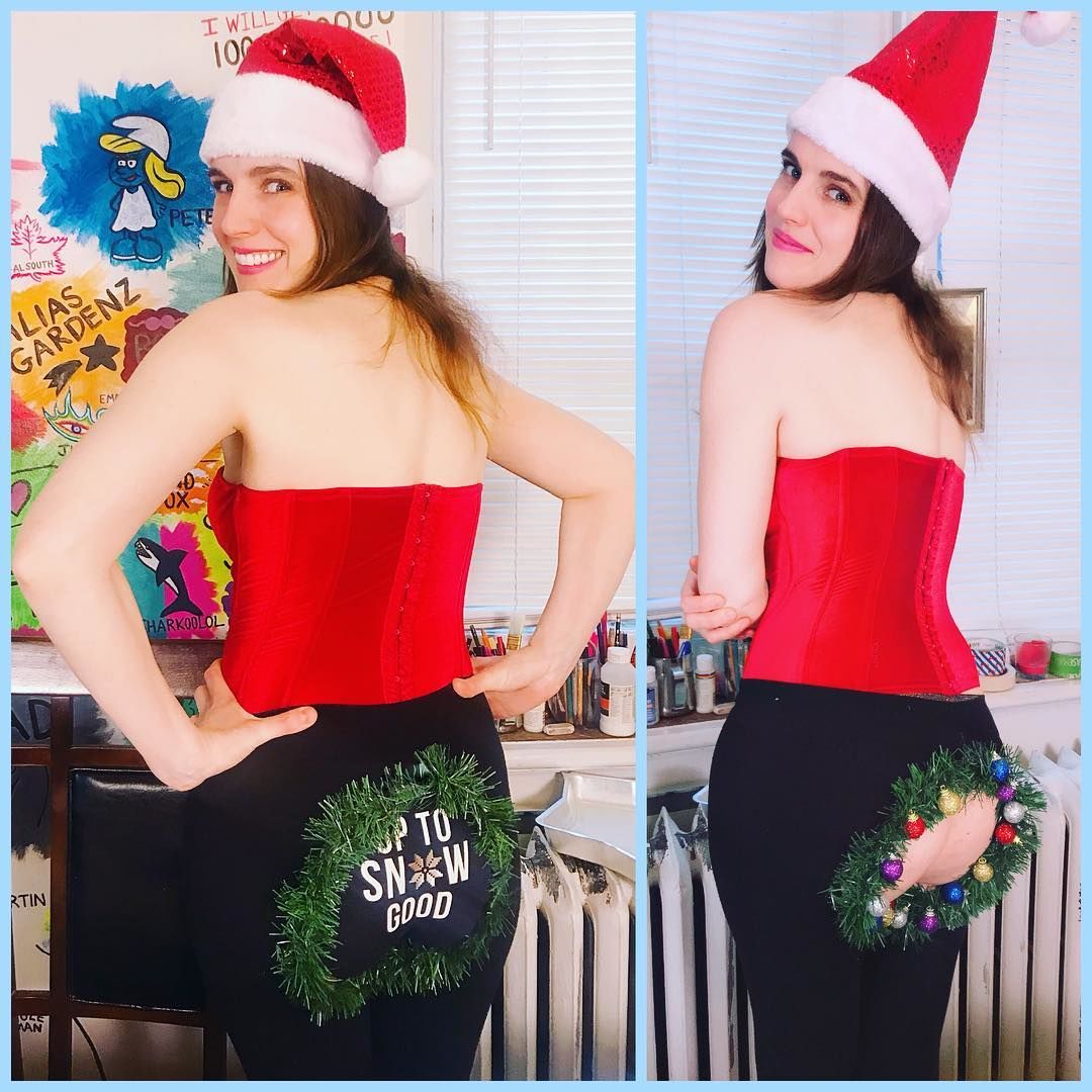 A képek alapján akár otthon is el lehet készíteni a szexi viseletet, elég egy kivágott harisnya vagy nadrág, aztán már csak körbe kell rakni mindenféle karácsonyi dísszel a fenekünket.