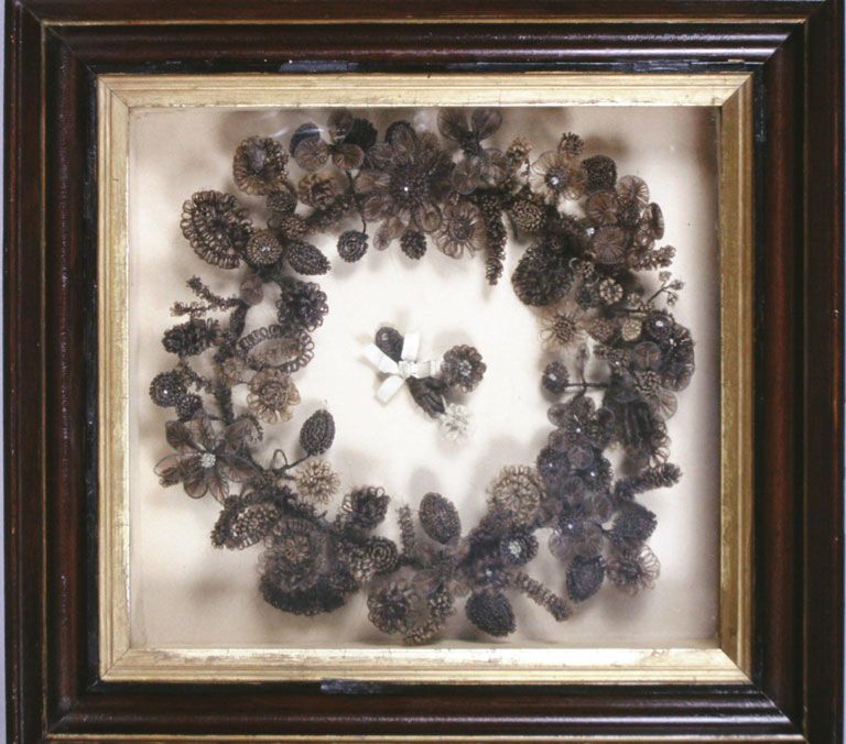 A kor egyik jellegzetes műremeke a patkó alakú koszorú, amely jól láthatóan több ember hajából lett elkészítve. Nemcsak családtagok boldog egységét ünnepelték ilyesmivel, de iskolai osztályok, templomi közösségek vagy más társaságok tagjai is időnként elkészíttették a maguk haj emlékművét.