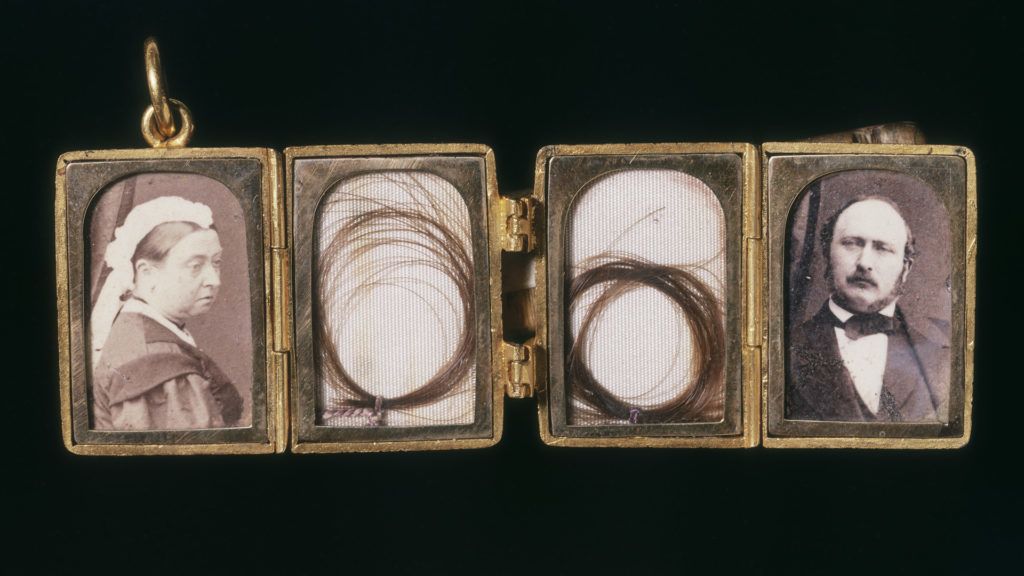 Viktória királynő és Albert fényképe és hajtincse egyetlen medálban