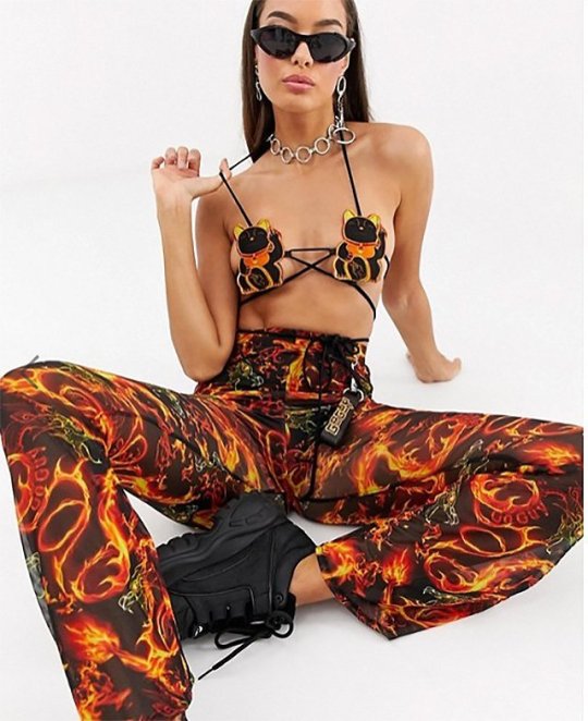 Egy-egy szerencsehozó, integető macska. Ennyi fedi összesen a melleket az Asos legújabb bikinifelsőjén. A két cicakivágás láthatóan húzza a zsinórt, amely a felső további részét képezi. És ennyi.