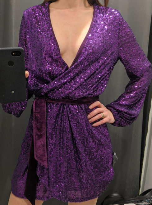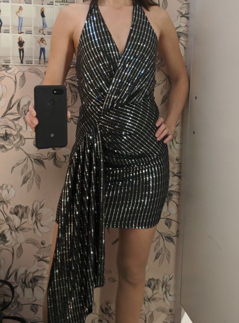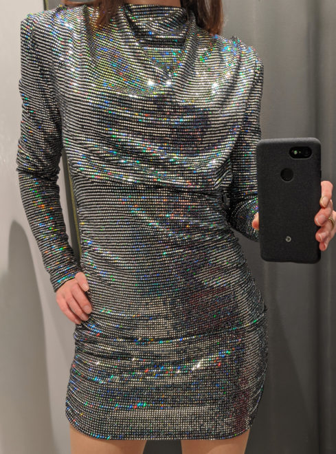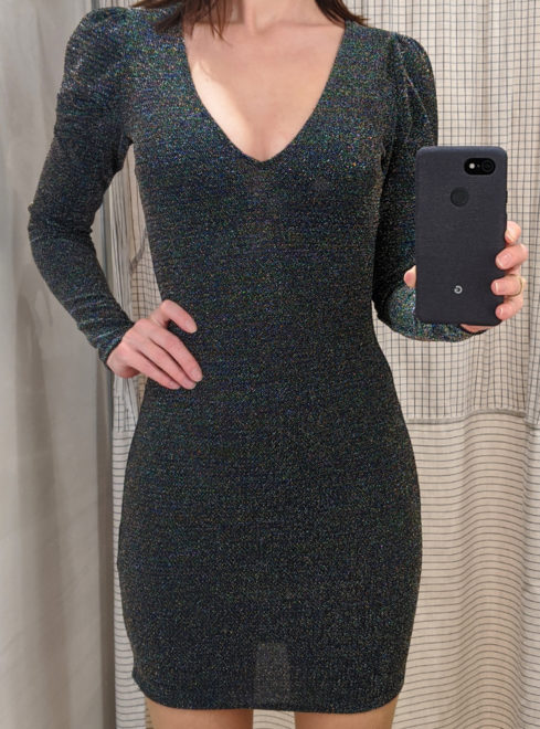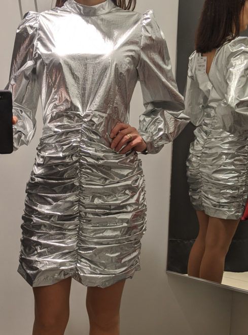 A lehető legtipikusabb darab a szezonban: cuppanósan szűk miniruha, vállnál és felkaron buggyos ujjal, diszkógömbszerűen csilli-villi textúrával. Ehhez hasonló modellekkel gyakorlatilag az összes fast fashion márka előrukkolt, vagyis egészen biztosan sokkal többet gyártottak belőlük, mint ahány nőnek ez a fazon jól áll. Ugyanis kizárólag tökéletes homokóraalkattal és hosszú, formás lábakkal nyújt elfogadható látványt.