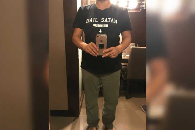 Az American Airlines egyik munkatársa mondta neki, hogy nem maradhat a Hail Satan (dicsőség a sátánnak) feliratú pólóban, amin a 666-os szám, és egy fordított kereszt is szerepelt. A nő nem értette a dolgot, de engedett, mert emiatt késett a felszállás.