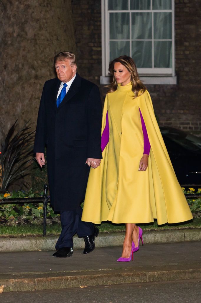 A first lady tavaly decemberben elkísérte férjét a londoni NATO-csúcsra. Angliai tartózkodásuk során ellátogattak a Downing Street 10-be, valamint arra a fogadásra is, melyet II. Erzsébet adott a Buckingham-palotában. Ez utóbbi két eseményre Melania Trump egy tőle meglehetősen szokatlan szettet választott: egy kanárisárga 7700 dolláros (2,3 millió forintos) Valentino köpenyruhát, fuksziaszínű tűsarkúval és ugyanilyen árnyalatú ruhaujjakkal, melyben leginkább úgy nézett ki, mint egy húsvéti tojás.