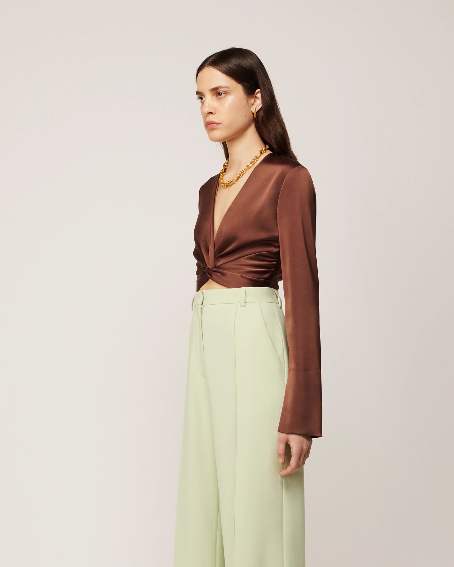Az Ula nézvre keresztelt barna, fénylő szatén felső a Nanushka 2020-as Pre-Fall kollekciójának darabja, elejét trükkös, csavarás díszíti és meglehetősen rövid kialakítású – bár ennek semmi jelentősége nem volt az online közvetített beszéd szempontjából. Sándor Szandra divattervező márkájának ruháit előszeretettel viselik a hírességek, láthattuk már Nanushkában Rihannát és Ashley Graham topmodellt is, kollekcióinak darabjait világszerte több mint harminc országban árulják és az olyan neves áruházak kínálatában is megtalálhatjuk, mint a Selfridges, a Liberty, az online működő Net-a-Porter vagy a MyTheresa.