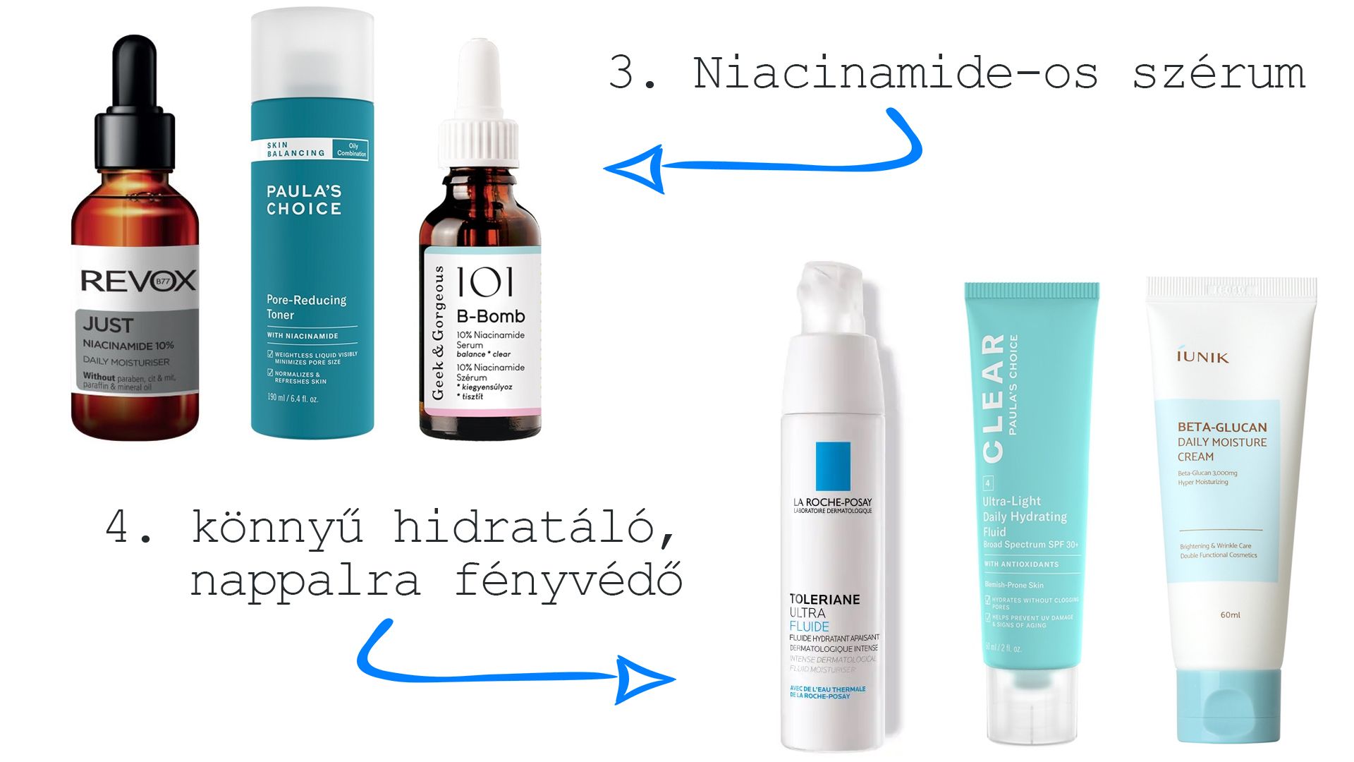 Könnyű hidratálók, fényvédő: La Roche-Posay Toleriane Ultra Fluide – PAULA’S CHOICE Clear Ultra-Light Daily Hydrating Fluid SPF 30+ hidratáló fényvédő – IUNIK Beta-Glucan Daily Moisture Cream