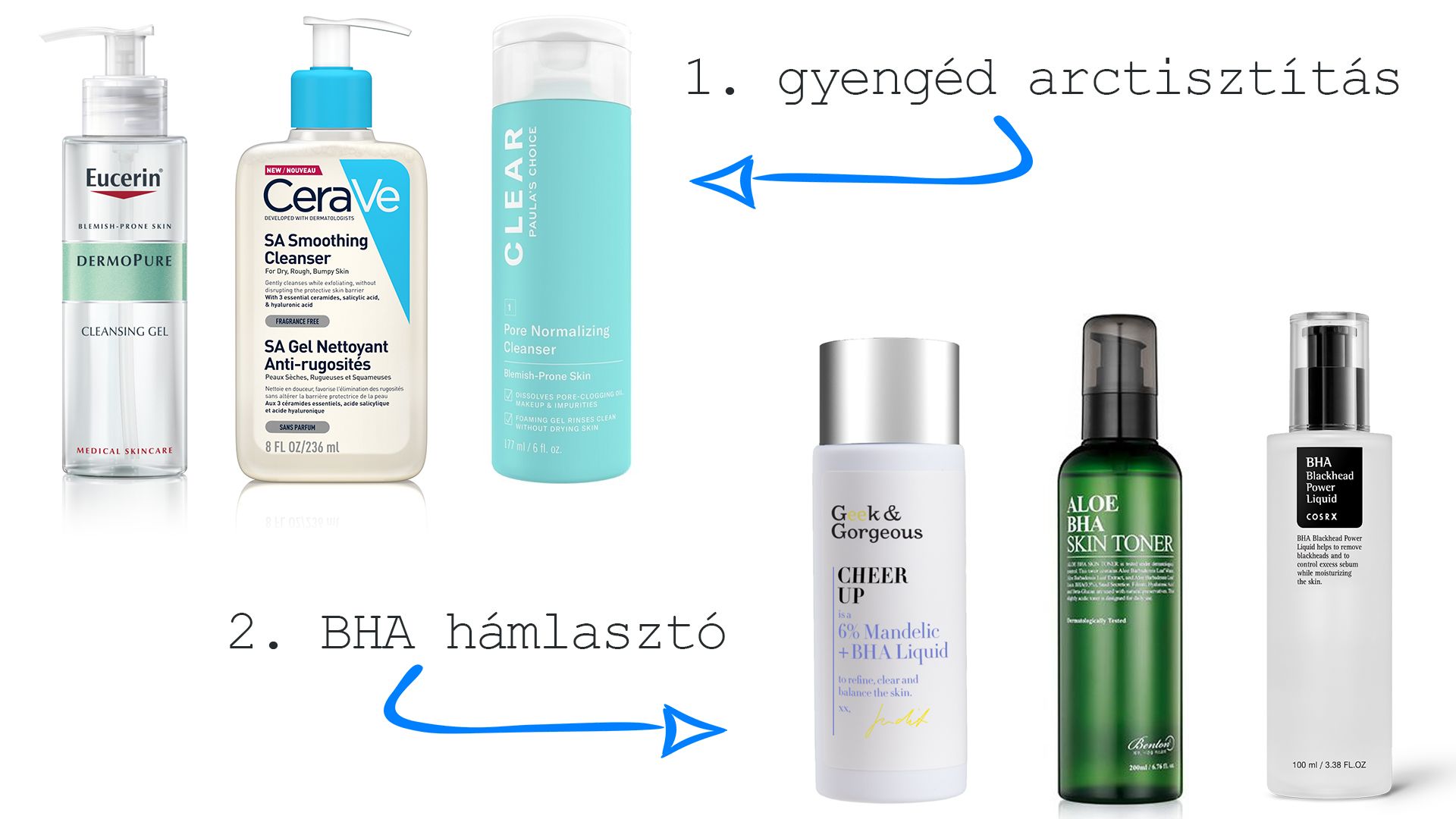 BHA hámlasztók: GEEK & GORGEOUS Cheer Up 6% Mandelic + BHA Liquid mandulasavas és szalicilsavas hámlasztó – Benton Aloe-BHA hámlasztó toner – COSRX BHA Blackhead Power Liquid hámlasztó