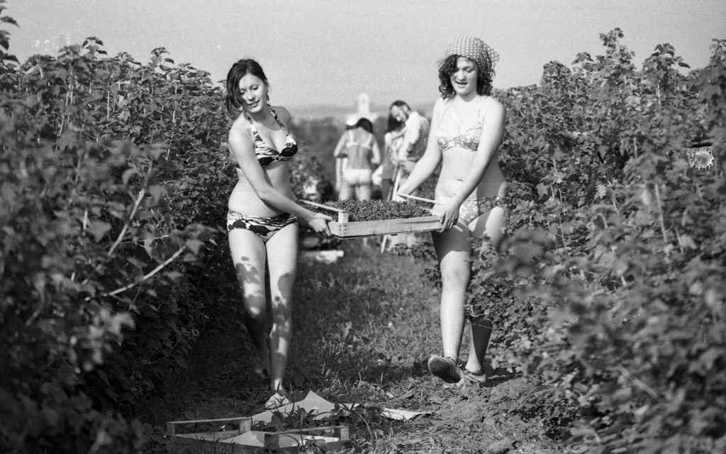 A balatonaligai KISZ építőtábor lakói a Balatonboglári Állami Gazdaság alsótekeresi üzemegységében ribizlit szednek 1974-ben (Fotó: Fortepan/Urbán Tamás)
