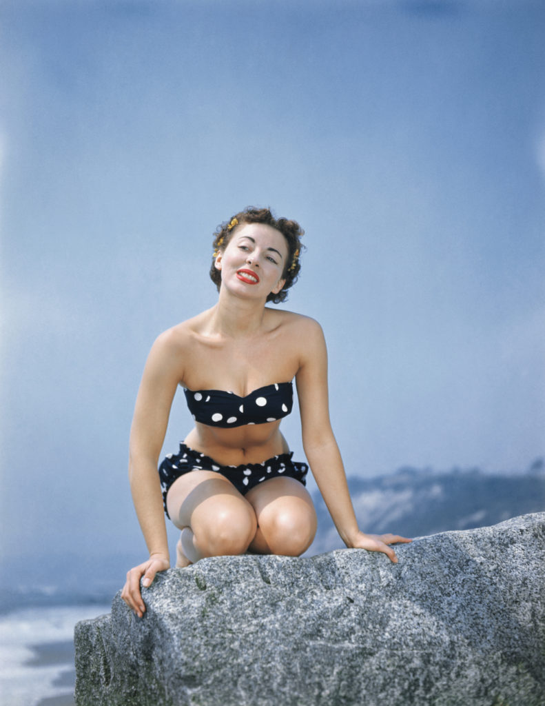 Pat Hall modell és színésznő egy pöttyös bikiniben (Fotó: Bettmann/Getty Images)