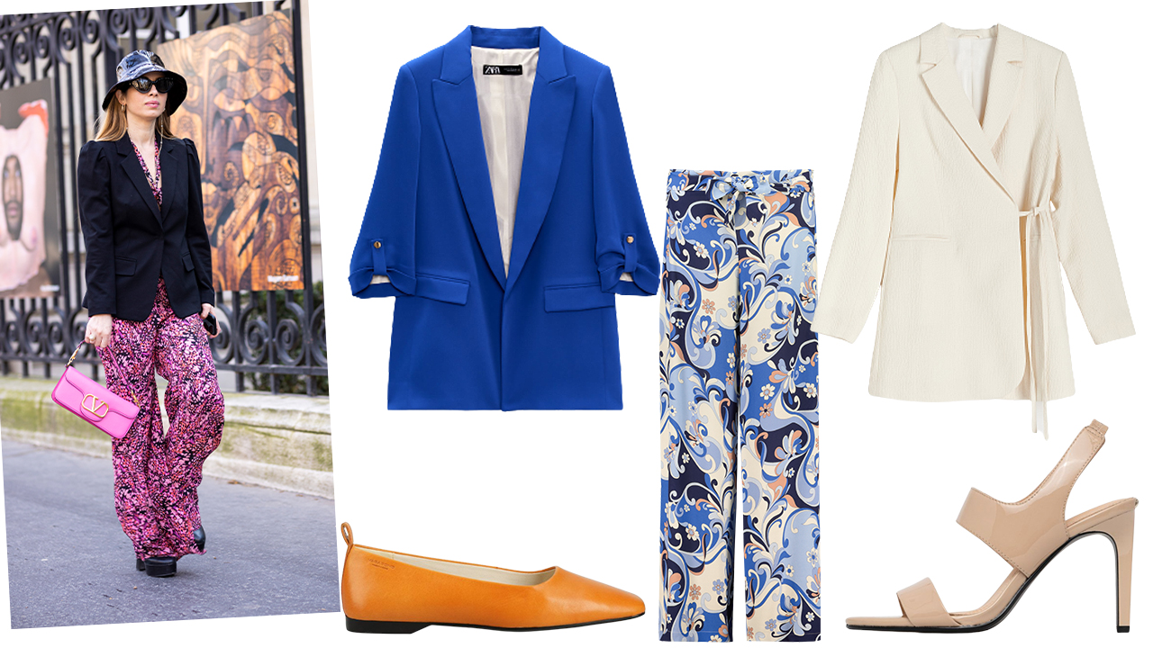 Mintás nadrág – F&F, Kék blézer – Zara, Krémszínű blézer- Reserved , Narancssárga balerina – Vvagabond/Answear.hu , Krémszínű magas sarkú szandák – Calvin Klein/Answear.hu (Fotó: Getty Images)