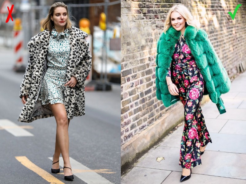 Mintás öltözékhez célszerű inkább egyszínű bundát választani, mely szintén lehet akár élénkebb színű is, azonban ebben esetben lényeges, hogy a ruha mintázatában is szerepeljen azzal megegyező vagy legalább hasonló árnyalat.