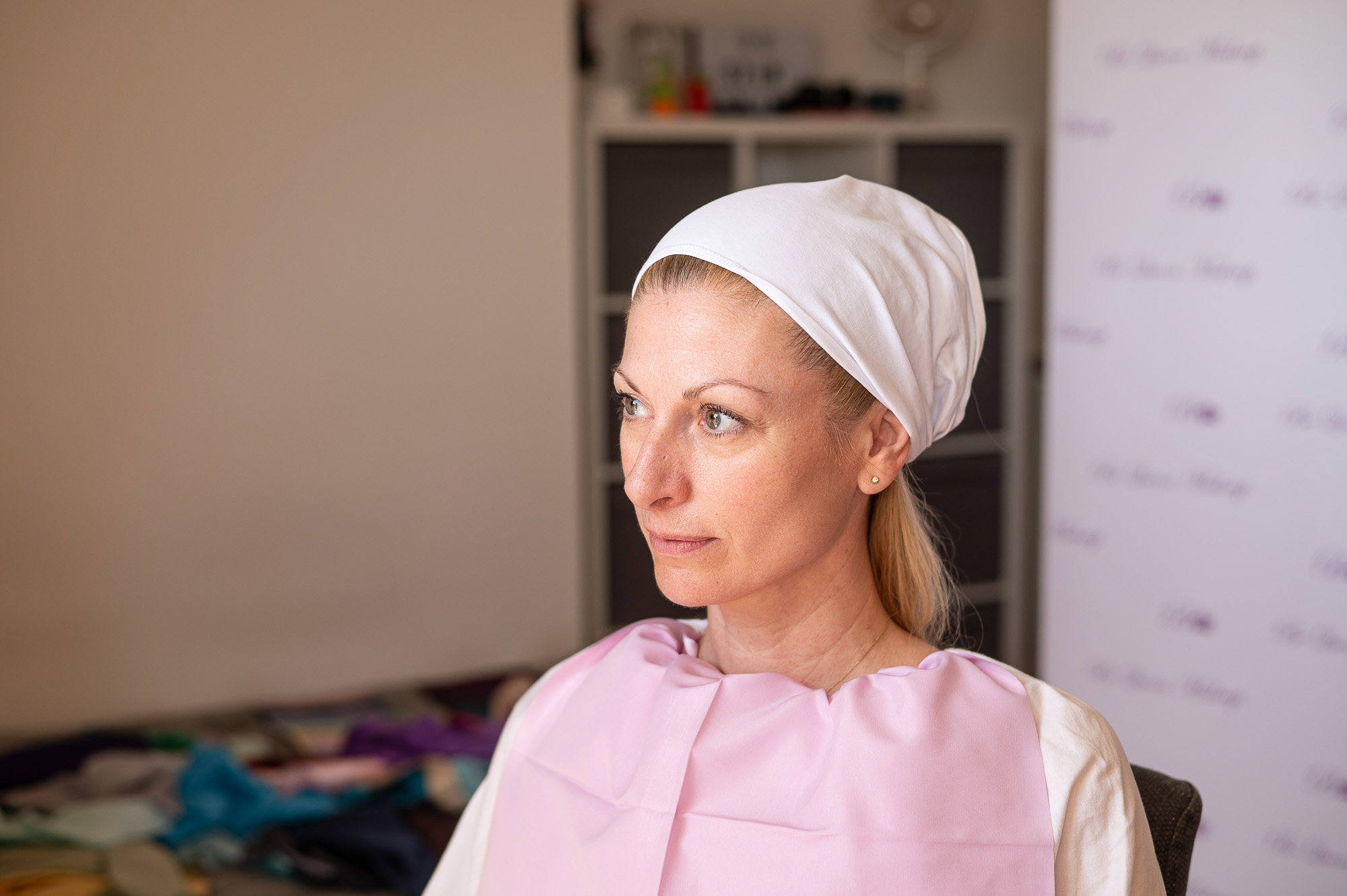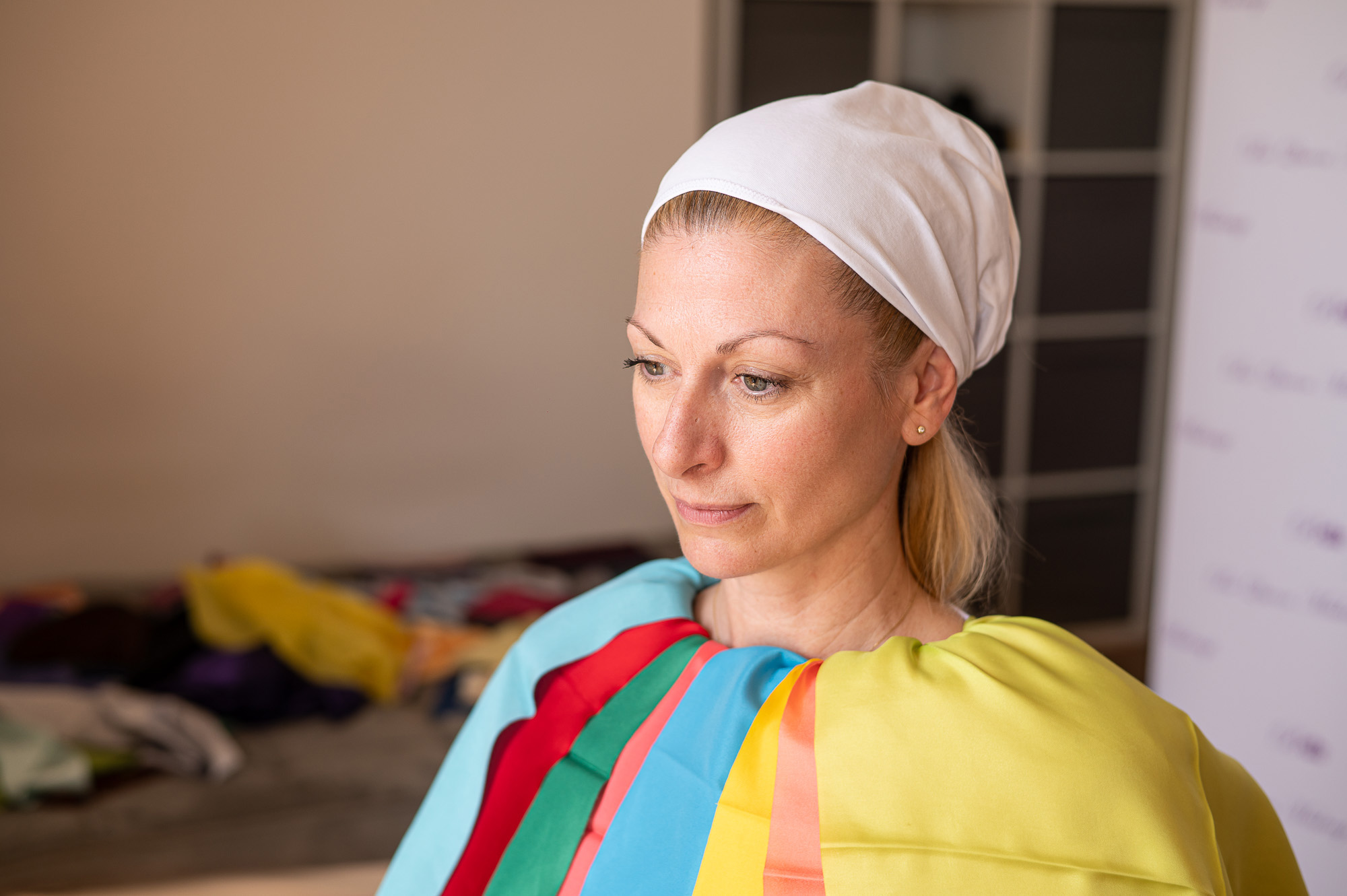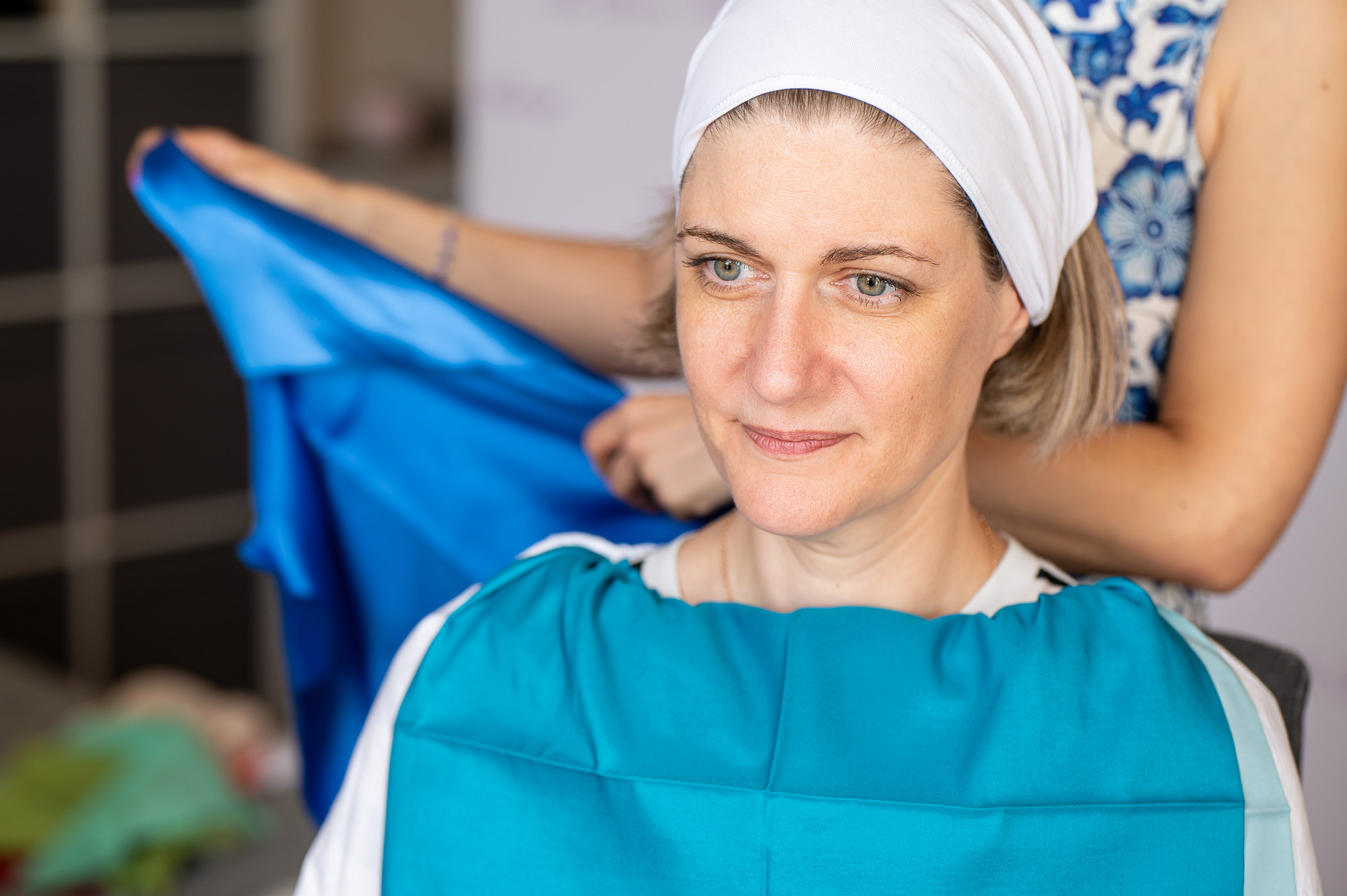 „A megfelelő színnel még smink nélkül is sokkal üdébbnek látszik az arc, és a szemszín is ragyogni kezd” – magyarázza a szakértő. Nem is kérdés, hogy ezek után kíváncsian várjuk, mikor ragyog fel az arcunk, aminek viszonylag nehéz dolga van ilyesmit tenni smink nélkül, fehér hajkendőben és fehér lepellel a vállunkon. Fehérrel kezdünk. Több kendőt is kapunk egymás után, állítólag ennél a színnél látszik a legkevésbé a különbség. Gabi a sötét színek szerelmese, nekem pedig a fél ruhatáram fehérből áll. Egyikünknél sem történt átütő változás, és valószínű, hogy ezen nem segített világos bőrünk és világos szemünk sem, bár érzékelhető volt, hogy más és már hatást keltett például a törtfehér vagy a vajszín. Ez lehet az oka annak is, hogy mindkettőnkön komor hatást keltett az ezt követő fekete, amely még a ráncokat is durván hangsúlyozta.