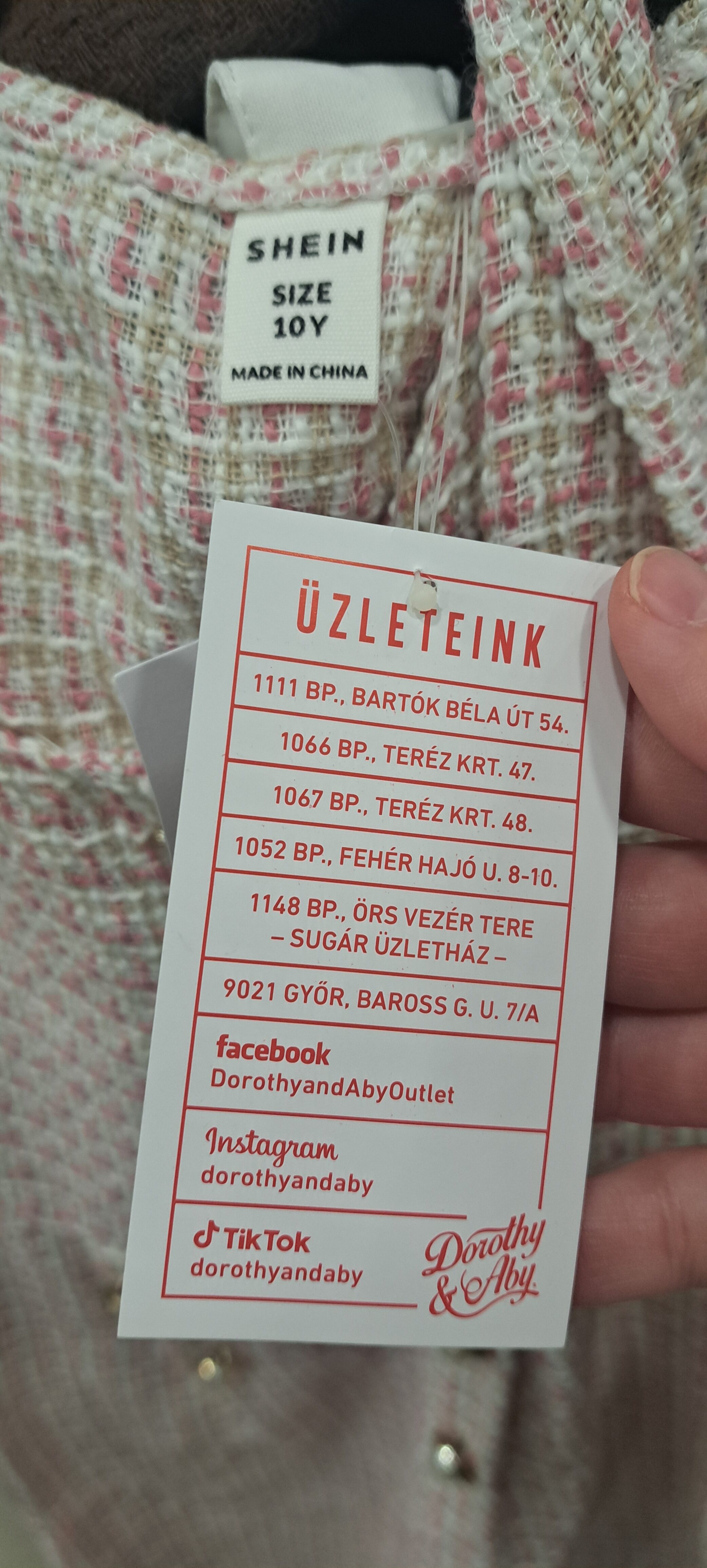 Ahhoz sem kell különösebben szemfülesnek lenni, hogy az ember azonnal kiszúrjon néhány egészen vad furcsaságot. Rengeteg holmi, de tényleg, szinte az összes ruhadarab SHEIN feliratú vagy felirat nélküli vállfa helyett Dorothy&Aby feliratú vállfán lóg a sorban. Az árcédulák, melyeken egyébként nem is olyan alacsony számok díszelegnek – egy aranyszínű nadrág ára például 4990 forint, míg egy pufi mellényé 9990 forint – egyik oldalukon az árat mutatják, másik oldalukon pedig a Dorothy&Aby üzleteinek listáját és a cég elérhetőségét. És hogy ez csupán egy suta kivitelezési-spórolási ötlet, egy különös marketinges ügyetlenség vagy az abszolút véletlen műve? Azt akár mindenki eldöntheti maga is, mi sem állítunk többet annál, mint hogy nagyon különös látvány ez akkor, ha az ember egy nemzetközi hírű és merőben más elnevezésű márka üzletébe érkezik…