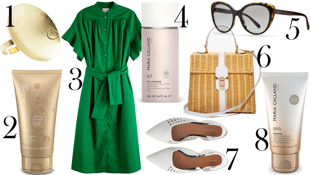 1. Kovácsolt kerek gyűrű – EVE by Eva Remenyi / 2. Baume Confort Reflect D’Or N°422 Különleges testápoló balzsam fényvisszaverő aranyszemcsékkel – Maria Galland / 3. Zöld ingruha – Scotch & Soda / 4. Cell’Defense Voile Anti-pollution Quotidien N°97 Fátyol fluid SPF30 – Maria Galland / 5. Teknőcmintás napszemüveg – Coach / 6. Fonott kézitáska – Coccinelle / 7. Fehér szandál – Zara / 8. Sun’Kiss Créme Hydratante Effet Bonne Mine N°96A Önbarnítót tartalmazó hidratálókrém – Maria Galland