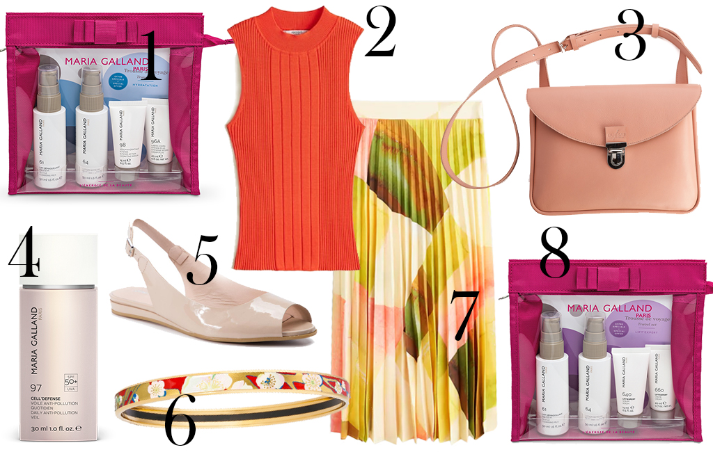 1. Trousses de voyage Limitált kiadású hidratáló utazószett – Maria Galland / 2. Narancssárga ujjatlan felső – Mango / 3. Barackszínű kézitáska – Ducsai Leather Goods / 4. Cell’Defense Voile Anti-pollution Quotidien N°97 Fátyol fluid SPF50 – Maria Galland / 5. Lapos talpú szandál – Gino Rossi / 6. Virágmintás karperec – Frey Wille / 7. Mintás midiszoknya – Mango / 8. Trousses de voyage Limitált kiadású Lift’Expert anti-aging utazószett – Maria Galland