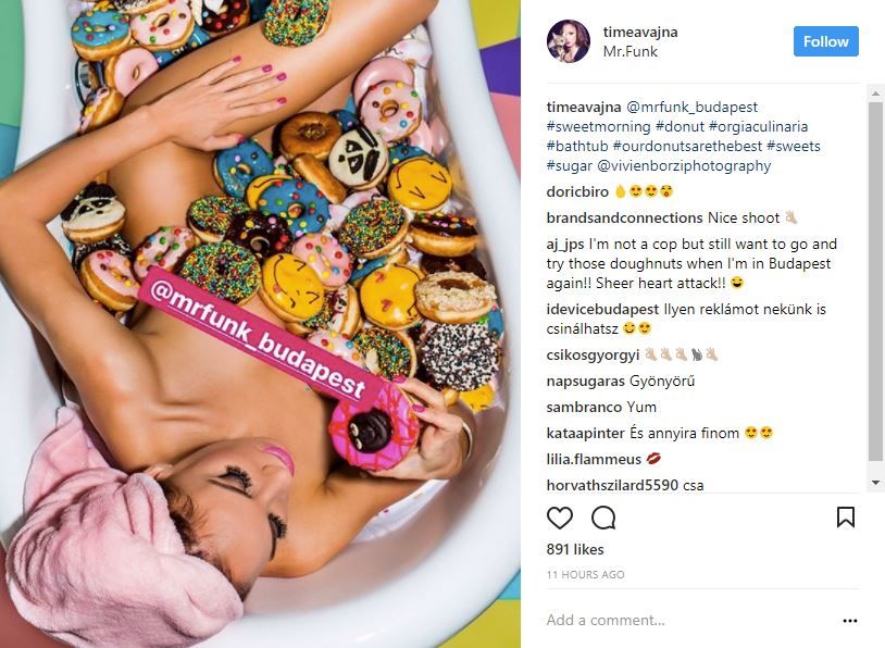 Tudtuk, hogy érkezik, hiszen Vajna Timi mutatott már werkfotókat eddigi legsikamlósabb reklámfotózásukról, ám a végeredmény még így is meglepő. Timi ugyanis egy kád fánkban pózol a kamerának, intim testrészeit csak a színes sütik takarják el úgy-ahogy.