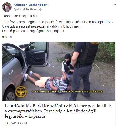 Van miért idegeskednie Berki Krisztiánnak, ugyanis őt is rendesen felültették az álhírvonatra. A Facebookon terjed egy kattintásvadász cikk, mely szerint 12 kiló fehér porral a kocsijában tartóztatták le a Berkit. A hír természetesen kacsa, de akkorát ment a közösségi portálon, hogy a műsorvezető kénytelen volt rá reagálni.